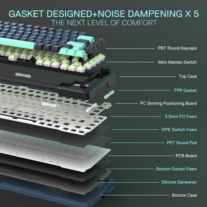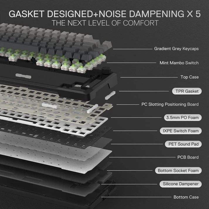 Được trang bị hệ thống giảm âm 5 lớp gồm mút PO 3.5mm, foam IXPE cho switch, tấm PET tiêu âm, foam đáy socket và đệm silicon đáy kết hợp cùng gasket silicon. Thiết kế này giúp giảm đáng kể tiếng vang rỗng, tạo âm gõ trầm, sạch và êm, mang lại cảm giác thoải mái và dễ chịu cho từng lần nhấn phím.