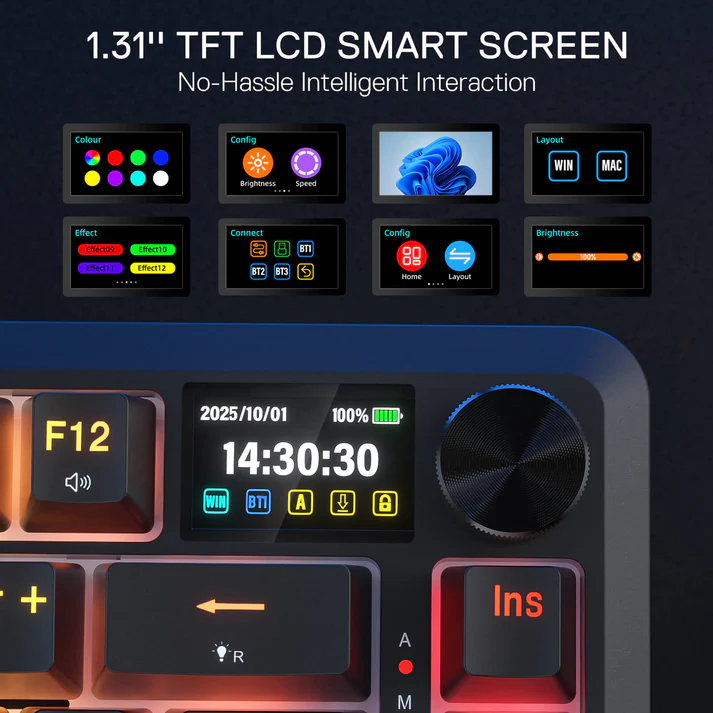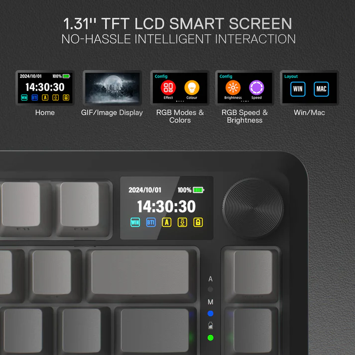 Màn hình TFT 1.41 inch đóng vai trò như trung tâm thông tin của bàn phím, hiển thị trạng thái kết nối, mức pin, tình trạng gõ phím và nhiều thông tin cần thiết khác. Ngoài ra, người dùng còn có thể tùy chỉnh GIF, meme theo tâm trạng, mang lại trải nghiệm sử dụng thú vị và cá nhân hóa hơn.