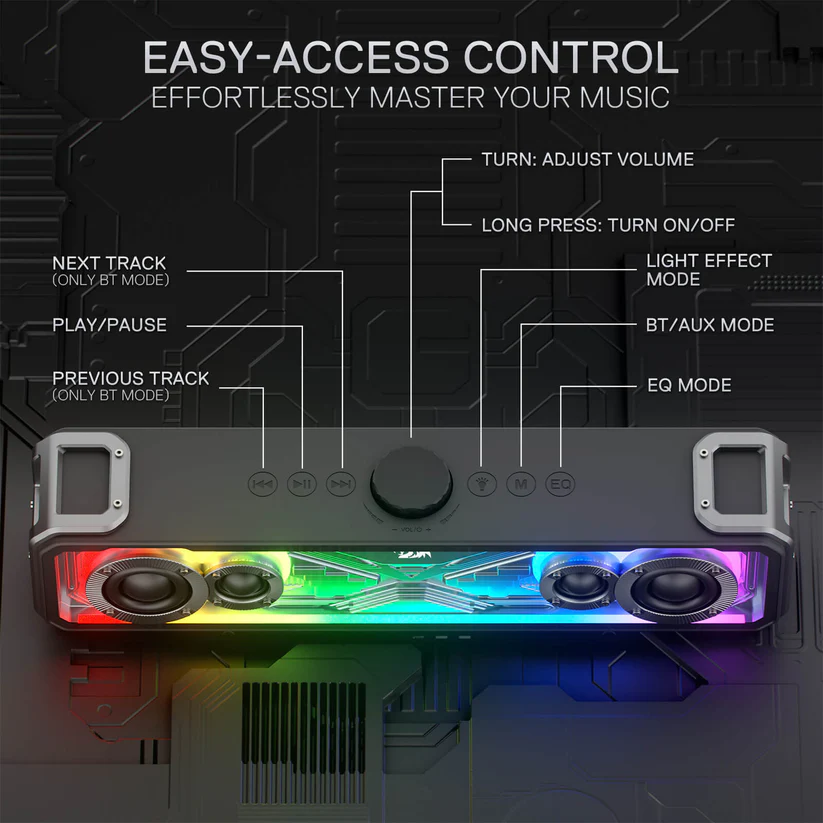 Loa Bluetooth Redragon cung cấp 3 chế độ EQ gồm Music, Game và Film, giúp tối ưu âm thanh theo từng bối cảnh sử dụng. Chỉ với một lần chạm, bạn có thể tận hưởng hiệu ứng âm thanh game sống động hoặc trải nghiệm nghe nhạc như đang ở một buổi hòa nhạc thực thụ.