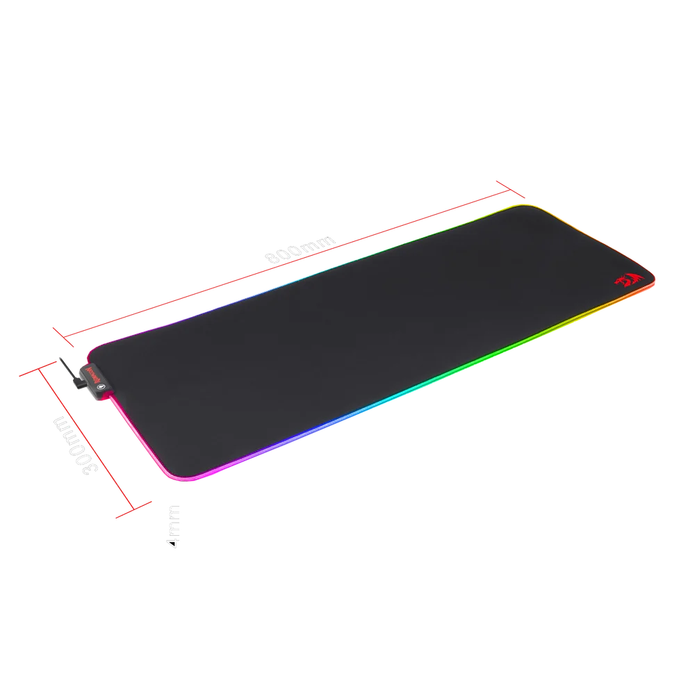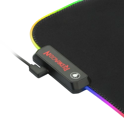 Ảnh cận cảnh mousepad RGB Redragon kích thước lớn, nổi bật với bộ điều khiển LED rời gắn trên dây USB cho phép chuyển chế độ ánh sáng dễ dàng. Viền mousepad được may chắc chắn chống sờn, dải LED RGB chạy viền đa màu hiển thị hiệu ứng mượt và đều. Bề mặt vải đen micro-textured giúp tracking chuột chính xác, phù hợp cho cả gaming lẫn làm việc trong các setup PC hiện đại.