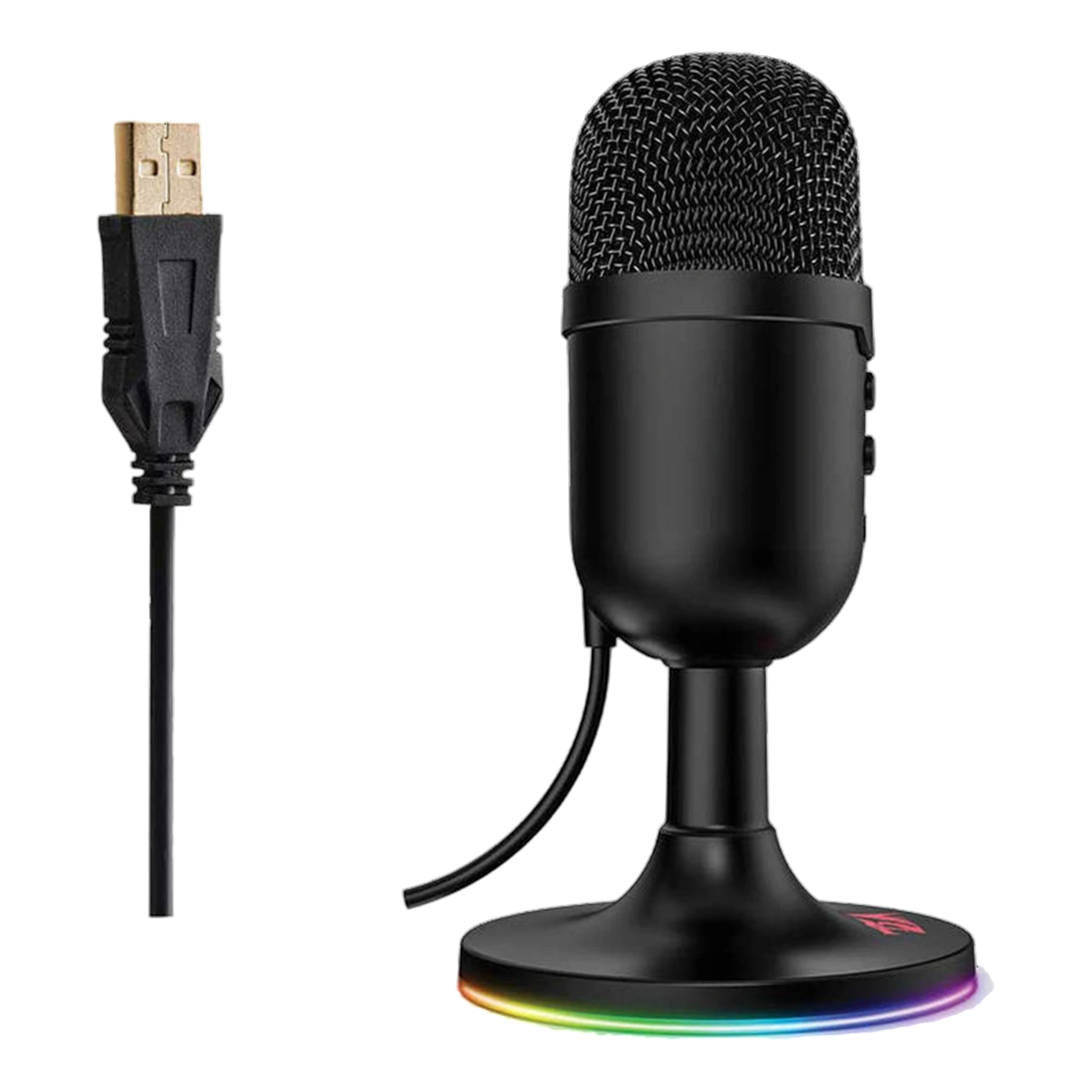 Còn hàngHình ảnh micro Redragon GM303 Pulsar với thiết kế để bàn nhỏ gọn, tông màu đen mạnh mẽ. Micro sử dụng kết nối USB plug & play, đi kèm dây liền thân tiện lợi. Phần đế tròn được trang bị dải đèn RGB phát sáng đa màu, tạo điểm nhấn gaming/streaming nổi bật. Tổng thể phù hợp cho nhu cầu stream, chat voice, học online và ghi âm cơ bản.